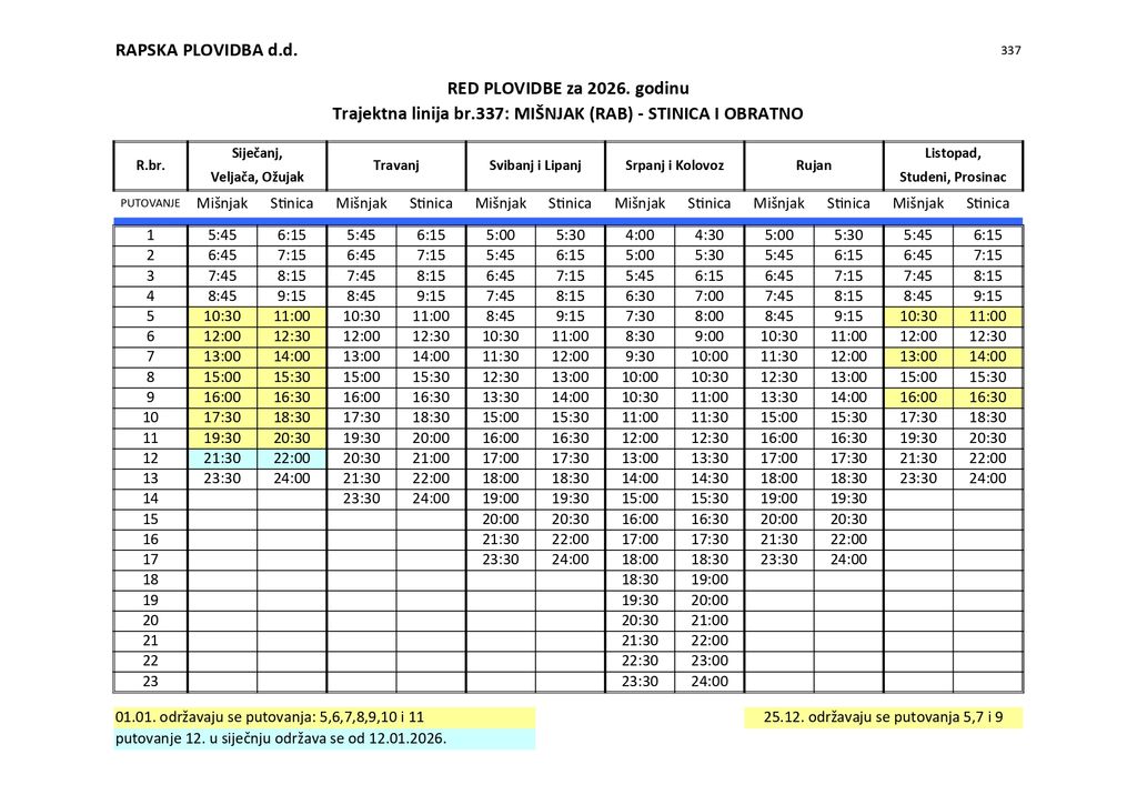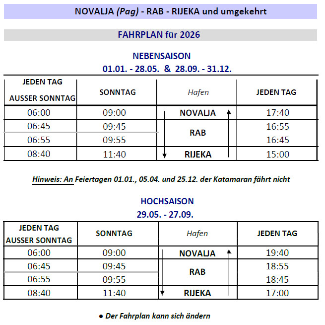 Wenn Sie mit dem Auto anreisen, kann Rab mit der Fähre aus zwei Richtungen erreicht werden: 1. mit der Fähre auf der Strecke Stinica (Festland) – Mišnjak (Insel Rab) und 2. mit der Fähre auf der Strecke Valbiska (Insel Krk) – Lopar (Insel Rab). Die Fäumlhrlinie STINICA - MISNJAK ist das ganze Jahr über in Betrieb. Die Fahrt dauert 15 Minuten. Während der Touristensaison verkehren Fähren unabhängig vom Fahrplan, solange Fahrzeuge vorhanden sind. Tickets kaufen Sie vor dem Einsteigen in die Fähre am Ticketschalter. Die Linie wird von Rabska plovidba d.d. Rab unterhalten.