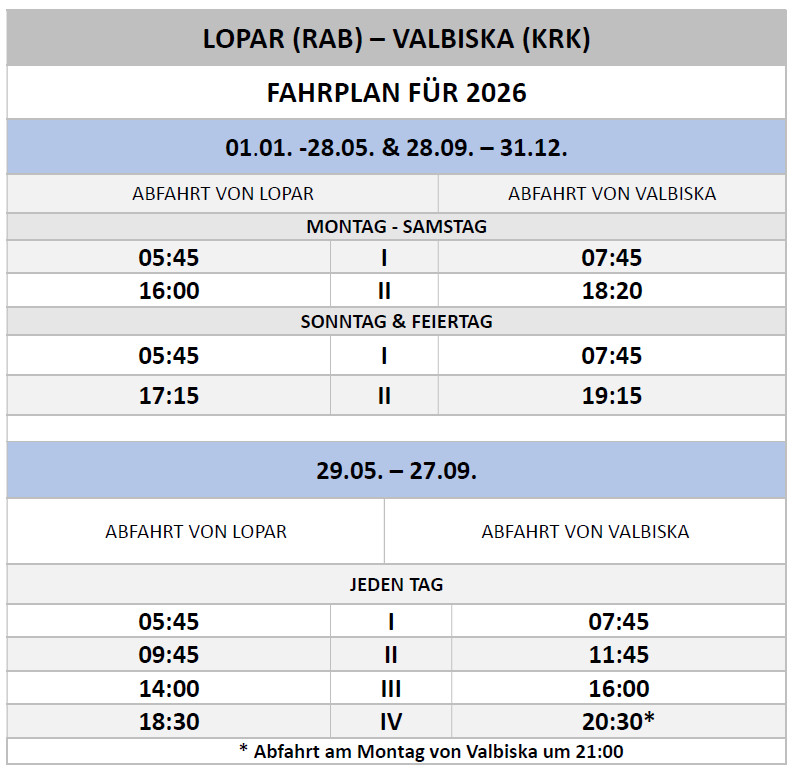Eine weitere Fährverbindung besteht zwischen Valbiska (Insel Krk) und Lopar (Rab), betrieben von JADROLINIJA d.d. Fähren verkehren das ganze Jahr über, mit Abfahrten zweimal täglich, in den Sommermonaten viermal täglich. Die Fahrt dauert ca. 80 Minuten.